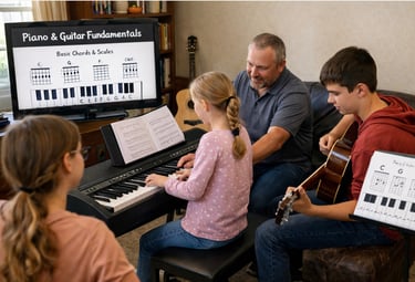 For piano students, we emphasize chord structure, scales, inversions, and foundational theory. For guitar students, we cover open chords, bar chords, fretboard familiarity, and applying rhythm in real musical contexts.